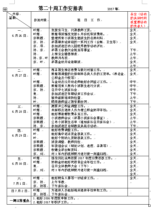 第二十周周工作安排表