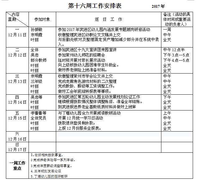 第十六周工作安排表