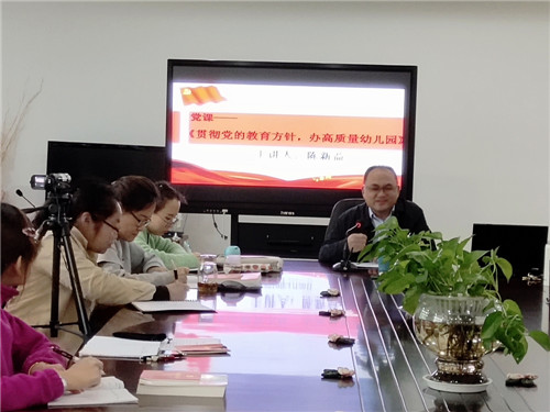 本次党课的内容为《贯彻党的教育方针,办高质量幼儿园》,陈主任从三个方面来阐述:他首先讲述了贯彻党的教育方针的必要性和迫切性,当前教育存在着教育体制的官僚化、形式主义,教育改革偏离流于形式,教育官本化,以师生为本难于体现,教育教学得不到较好的重视。教育供给市场化,家庭教育成本大幅增加,学校、教育、家庭三者的平衡状态改变了。教育立场阶层化,教育决策者与受教育者产生分离,教育政策和决策脱离实际,教育公平困难。其次陈主任讲述了如何在幼儿园贯彻党的教育方针,办高质量幼儿园。要贯彻党的教育方针,必须坚持党对教育的领导,坚持社会主义办学方向,坚持教育的人民立场,要早期介入,不违背幼儿教育规律,解决课程专业性政治性浓厚的问题。最后陈主任还理论联系实际,结合党的教育方针,介绍了高质量幼儿园的标准为要有坚定的信仰,有正确的发展策略,有坚强的领导核心,打造强有力的领导团队。